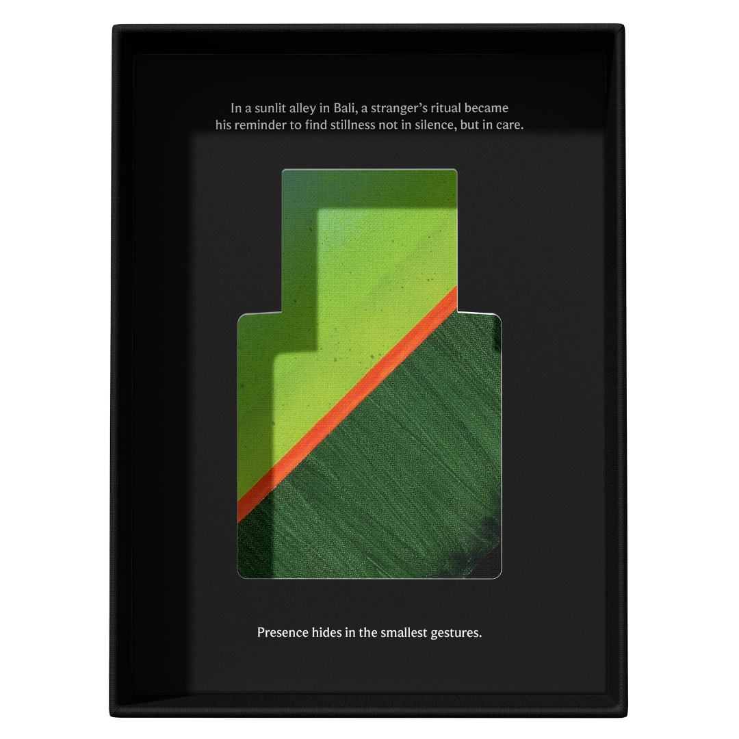 The scene shifted something in him, a reminder that reflection often comes unplanned. This scent captures that moment of calm awareness, warm, meditative, softly vibrant, and gently effervescent.